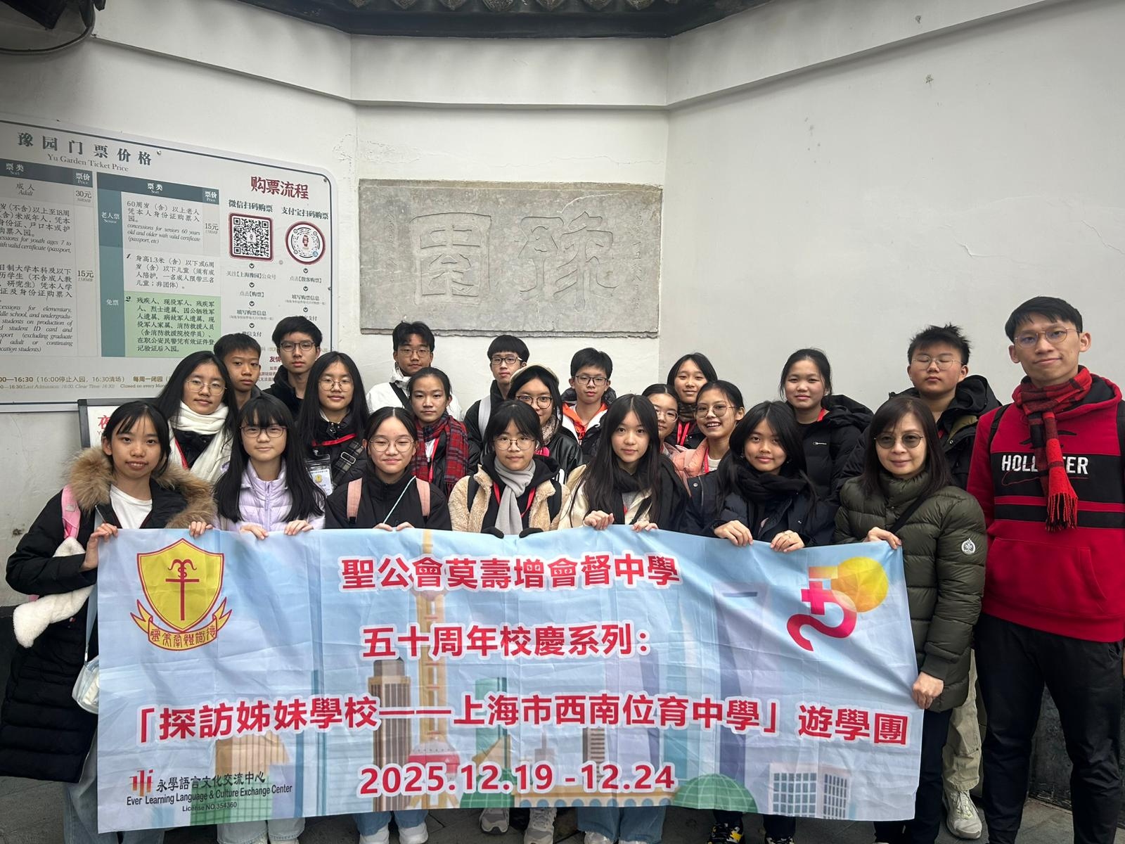 To celebrate our school's 50th anniversary and further deepen the bond with our sister school in the Mainland, the External Affairs Committee successfully organized the "Sister School Visit: Shanghai Southwest Weiyu Middle School Study Tour" from December 19 to 24, 2025. Led by Principal Ms.Wong Lee Lee and Mr. Lau Wai Yip, a delegation of twenty Secondary 2 and 3 students embarked on a six-day immersive learning journey in Shanghai.